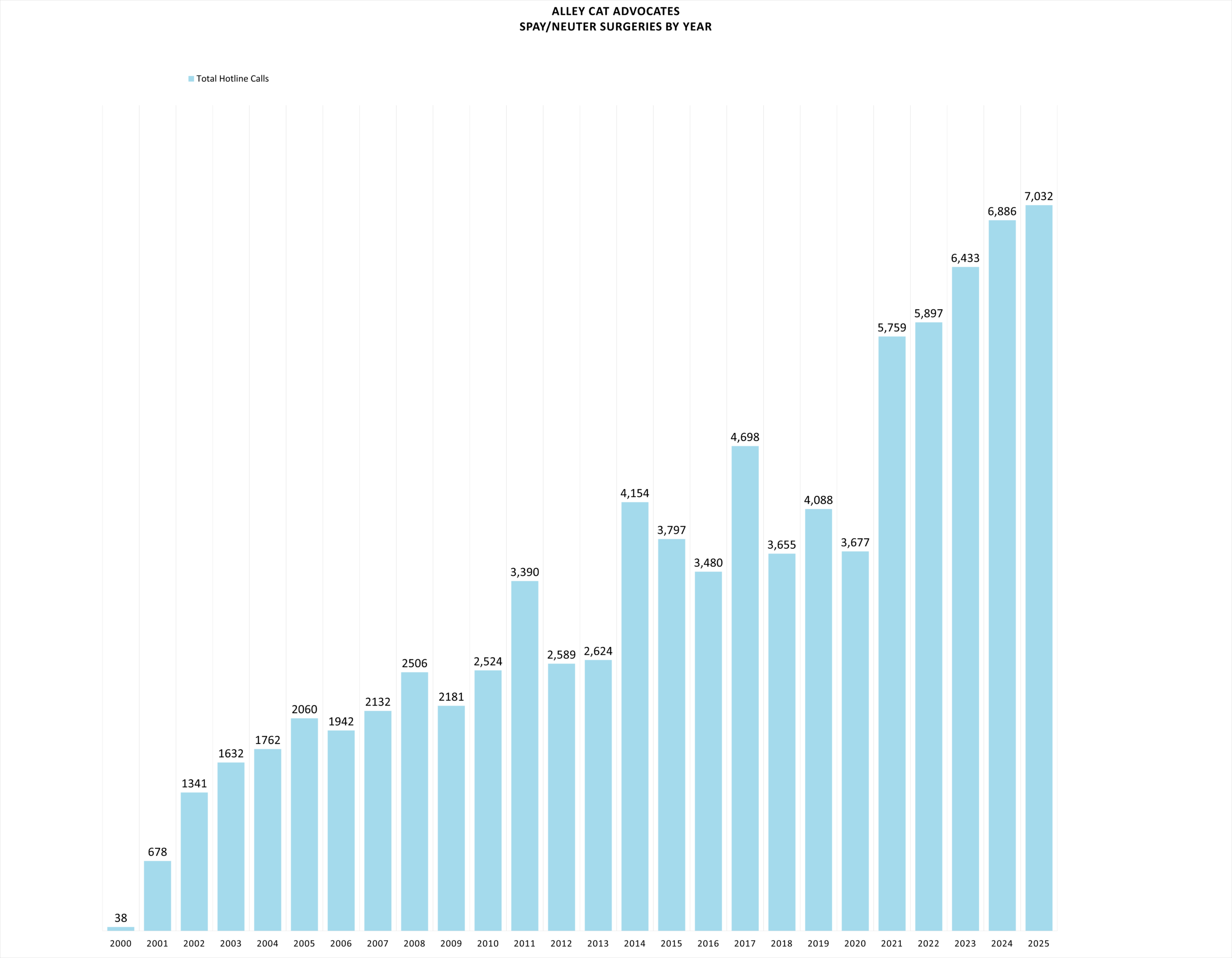 Thanks to the help of our volunteers and donors, we have spayed or neutered over 86,000 cats since performing our first surgeries in October of 2000.